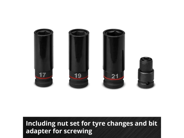 It has an integrated LED light for optimum visibility of your working area. In order to quickly have both hands free while working, a belt clip is provided for easy interim storage of your cordless impact wrench on your belt. With its internal hexagon bit adaptor, supplied, you can also screw in large, long wood screws without any problems. A practical nut set for changing tyres is also included in the scope of delivery.