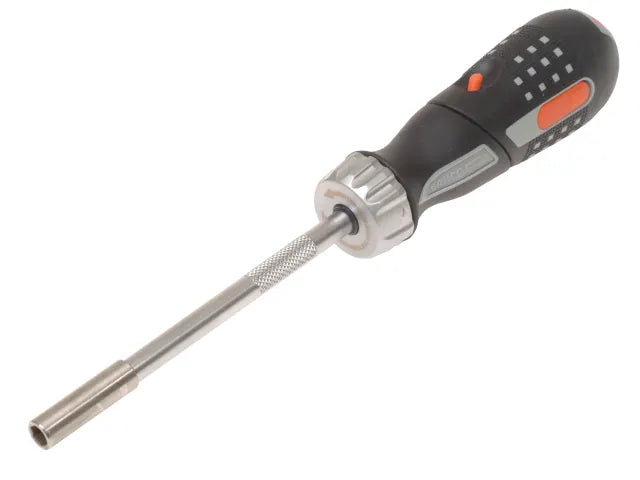 The Bahco 808050P Pistol Ratchet Screwdriver 1/4in with magnetic bit holder. Has a three-component handle with textured finish for maximum torque and minimum effort. Handle swivels and locks at 30° position for application of higher torque when necessary. This is especially important in work areas where there is little room to twist the screwdriver and the user’s hand. Locks at 180° for normal operation.
