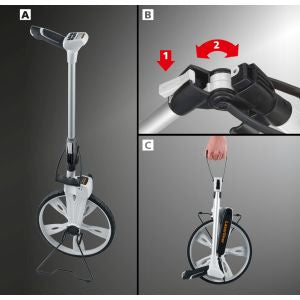 Description: This reliable roller distance measuring device is designed for use in straight lines and curves. The measuring wheel is accurate to the nearest centimetre up to 9,999.9 metres. Measured values are shown on the easy-to-read display. A movable indicator provides information on the exact start and final position. Rolling the wheel forwards adds to the measured values while rolling it backwards subtracts. The device has a hold function for locking the current value on the display. Five entries can be stored in the measured value log for documentation purposes. Easy to transport due to folding design.