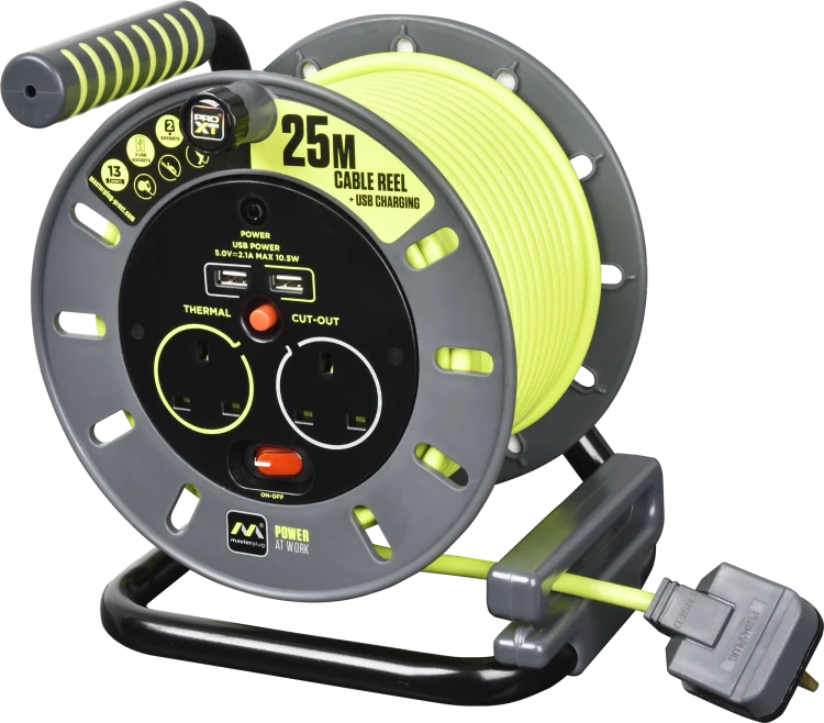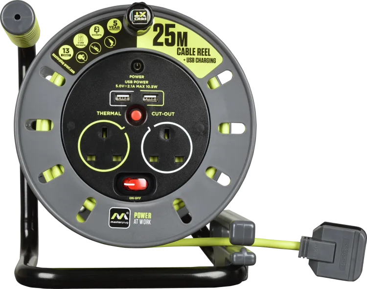 Masterplug 2 SKT 25M 13A med open extension reel + USB UK OMU25132USL-PX Power up your devices with Masterplug. With two sockets and a 25M cord, this extension reel allows you to connect and charge your electronics from a distance. Enjoy the added convenience of two USB ports, making it a versatile choice for all your power needs.