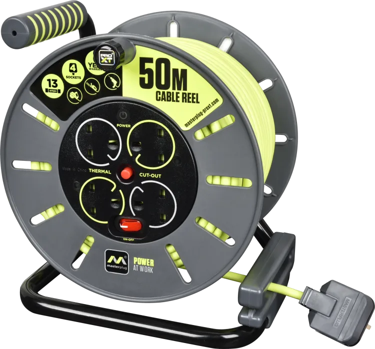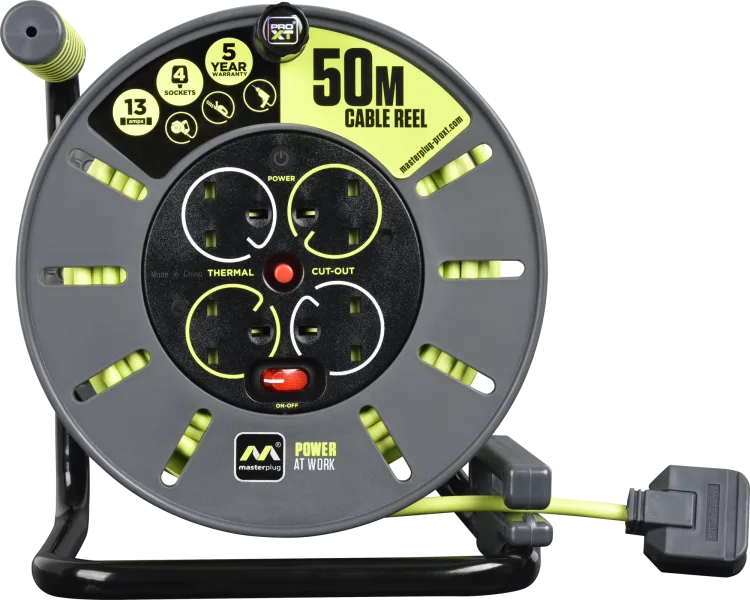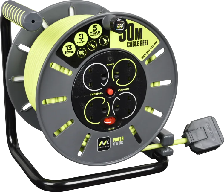 Masterplug 4 SKT 50M 13A LARGE OPEN REEL extension lead UK The Masterplug 4 SKT 50m 13A large open reel extension lead UK is a reliable and heavy-duty option for powering multiple devices with its 4 sockets.